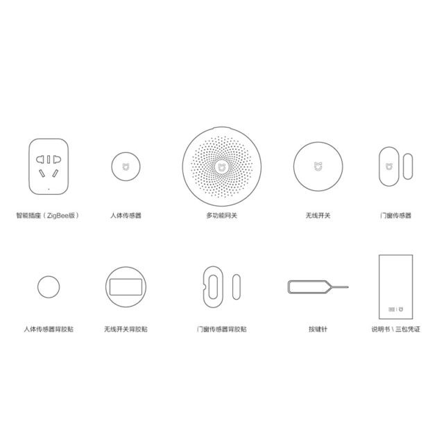مجموعه کیت خانه هوشمند میجیا شیائومی شامل ۵ قطعه می باشد: کنترل از راه دور چند منظوره شیائومی، سنسور در و پنجره، سوئیچ هوشمند وایرلس، سنسور بدن انسان و پریز (نسخه Zigbee)